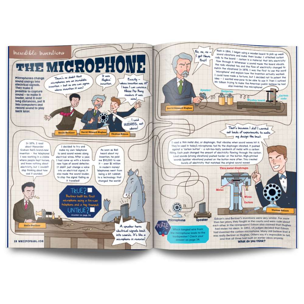 Get hands-on with exciting experiments as you build your own speaker. Discover how an incredible invention, the microphone, captures sound. Make a paper cup telephone and see sound waves in action, then watch cornflour gloop dance on a speaker. Ever wondered what’s faster than sound? You can read about ten surprising things that can beat it in a race.